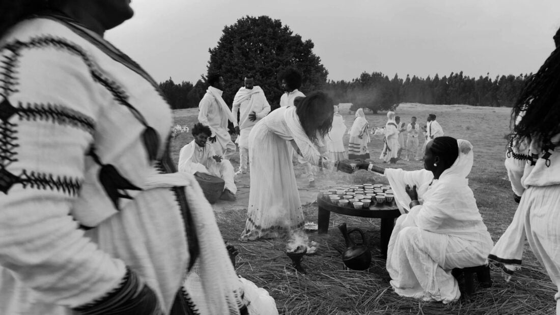 The coffee you drink while running will disappear ሲሮጡ የጠጡት ቡና ሲሮጡ ይጠፋል ofrece una alternativa al régimen temporal occidental, en el que el tiempo se ha convertido en una mercancía y el café se ha reducido a un estimulante de la productividad. Filmada en una sola toma, la obra traduce la ceremonia etíope del café en una partitura viva donde convergen movimiento, sonido y aroma. Mientras el incienso tiende un puente entre los reinos material y espiritual, y el masenqo llena el espacio con melodías nostálgicas que suspenden el tiempo, la ceremonia culmina en una danza colectiva: una erupción de alegría que propone la convivencia, el ritmo y la conciencia corporal como modelos alternativos al tiempo introspectivo y extractivo.