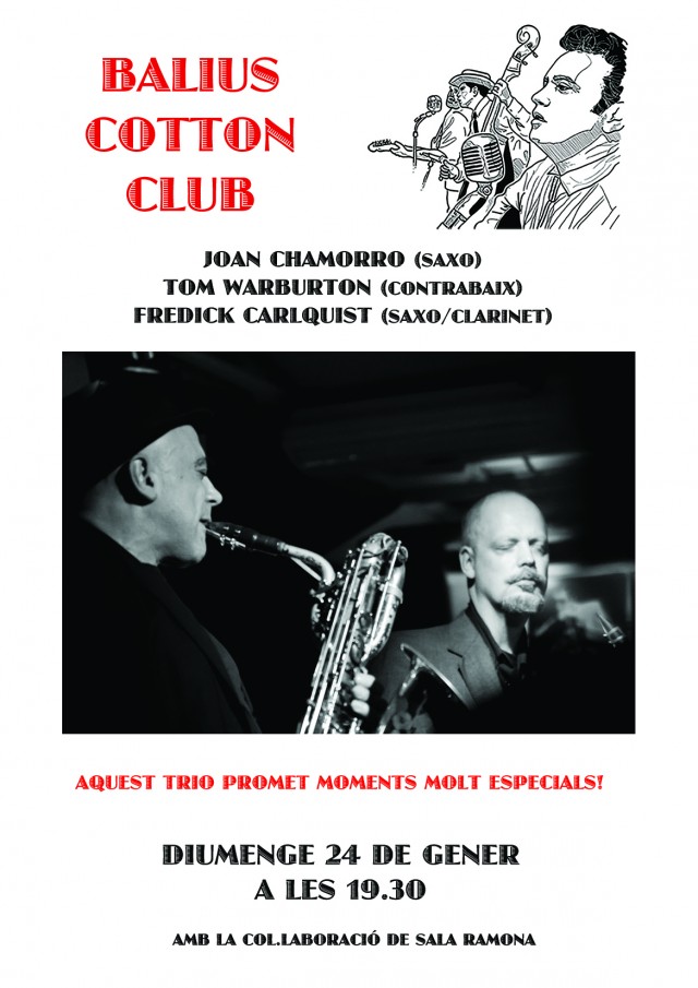 Dentro del espacio semanal de Jazz “Cotton Club”, Balius Bar en colaboración con la Sala Ramona presenta a los saxofonistas Joan Chamorro y Fredrik Carlquist que junto al contrabajista Thomas Warburton tocarán el mejor jazz de cámara.